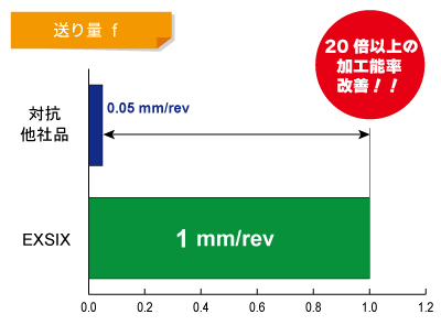 他社品では1刃あたりの送り量が0.01と条件が低く、能率が悪い。
