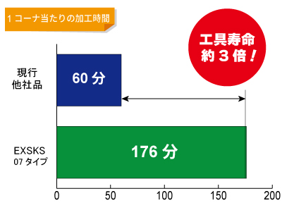 | ①長寿命化 現行他社品はチッピングによりインサート1コーナあたり60分の寿命であったが、EXSKS-07タイプは176分/コーナ加工後も正常摩耗で継続使用可能!工具寿命3倍で、長寿命化を実現! ②加工能率向上 現行他社品が3枚刃であるのに対し、EXSKS-07タイプは5枚刃に。刃数の増加で加工能率もUP! |