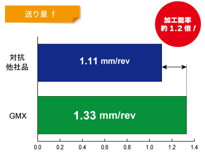 ①低抵抗 現行のカッタに対して刃数は増加したが、SUS316Lの荒加工においても低抵抗であった。 ②高能率化 刃数増加により33%の寿命アップ、送り量 f も1.11→1.33 (mm/rev)に増加し、加工時間短縮を実現。 |