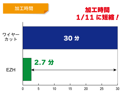 | ①加工時間短縮 従来の放電加工では30分/穴かかっていたが、EZハードドリルでは、2.7分/穴と大幅な加工時間短縮に成功。 ②加工能率向上 62HRCの高硬度材にも関わらず、67穴加工可能と長寿命。 「高硬度材の穴あけ加工にはワイヤーカットのみである」という固定観念を覆すことに成功! |