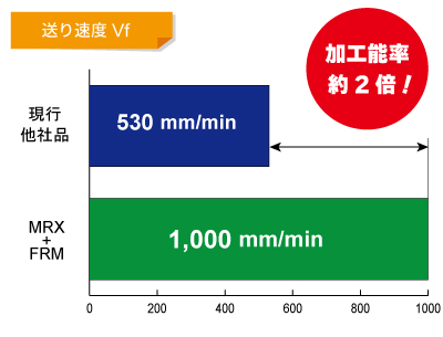 | ①高能率化 現行の刃先交換式ラジアスエンドミルと比較し、送り速度 Vf が、530→1,000 (mm/min)と約2倍に増加し、高能率化を実現。 ②加工面精度◎ モジュラーヘッドタイプと頑固一徹の組み合わせでびびりを抑制し、加工面良好◎ |
