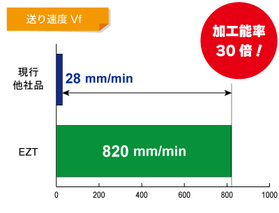 | ①高能率化 現行のハイスドリルと比較して、回転速度n が1,370 → 6,850 (min⁻¹ )、送り速度Vfが28 → 820 (mm/min)と大幅にアップし、加工能率は約30倍に! ②工具寿命向上 現行のハイスドリルでは40穴程度しか加工できなかったが、EZT形は1,850穴の加工に成功!加工穴精度も問題なく、ステンレスのロールタップ下穴加工において高精度穴あけ加工を実現! |