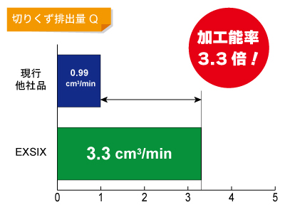 | ①加工能率向上 高硬度材の溝加工において、送り速度 Vf が、60→200 (mm/min)に。切りくず排出量 Q も 0.99→3.3 (cm³/min)となり、加工能率約3.3倍と大幅UP! ②長寿命化 アキシャルレーキ角がポジ仕様の低抵抗設計インサートによりチッピングが抑制され、現行の2パスはもちろん、4パス加工後も継続使用可能との結果に。インサート寿命は2倍以上に。 |