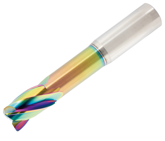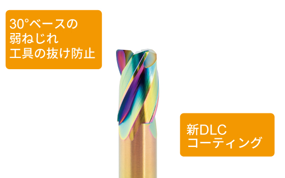 近年需要の高まっているアルミの高速加工に対応するため、高速回転に対応。加工能率は従来モデルと比較して大幅にアップ。30°ベースの弱ねじれにより軸方向への負荷を抑え、工具の抜けを防止。また、新DLCコーティングの採用により、平滑性に優れ、高寿命。