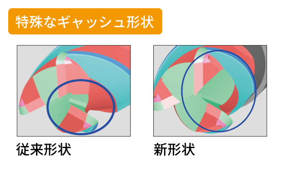 特殊なギャッシュ形状により、中心刃と工具のバランスを両立。回転のふらつき防止、優れた切りくず排出性を実現。ギャッシュ形状は特許取得済み(特許第7695461号)。