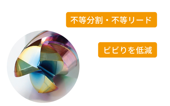 3刃すべてが異なるねじれ角をもつ、不等分割・不等リードを採用。加工時のビビりを大幅に低減。