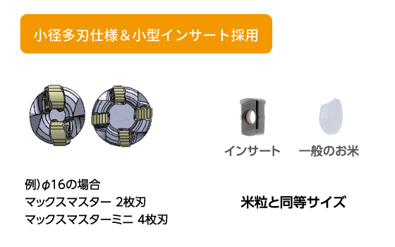 インサートは両面4コーナ仕様で経済的。米粒と同等サイズの小型インサートにより、多刃仕様を実現。従来のマックスマスターの特長を維持しつつ、さらなる高能率加工が可能に。